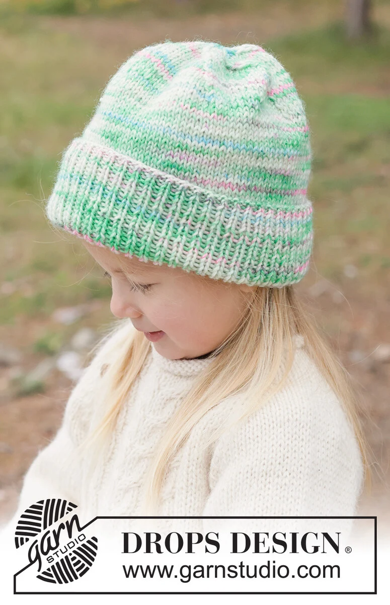 Dziecięca czapka na drutach z włóczki DROPS Fiesta. Przerabiana dżersejem, z wyłożeniem. Od 2 do 14 lat.
