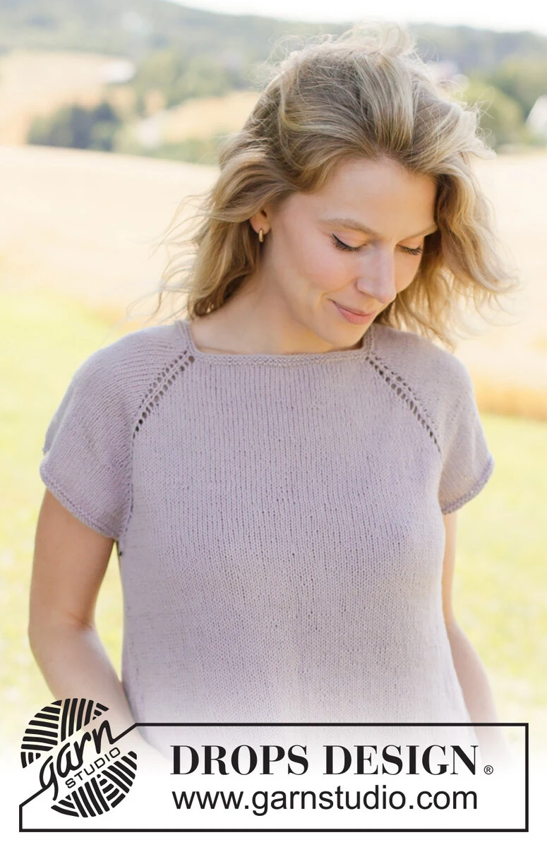 Top na drutach z włóczki DROPS Safran. Przerabiany od góry do dołu dżersejem, z reglanowymi rękawami, krótkimi rękawami i ściegiem francuskim. Od XS do XXXL.