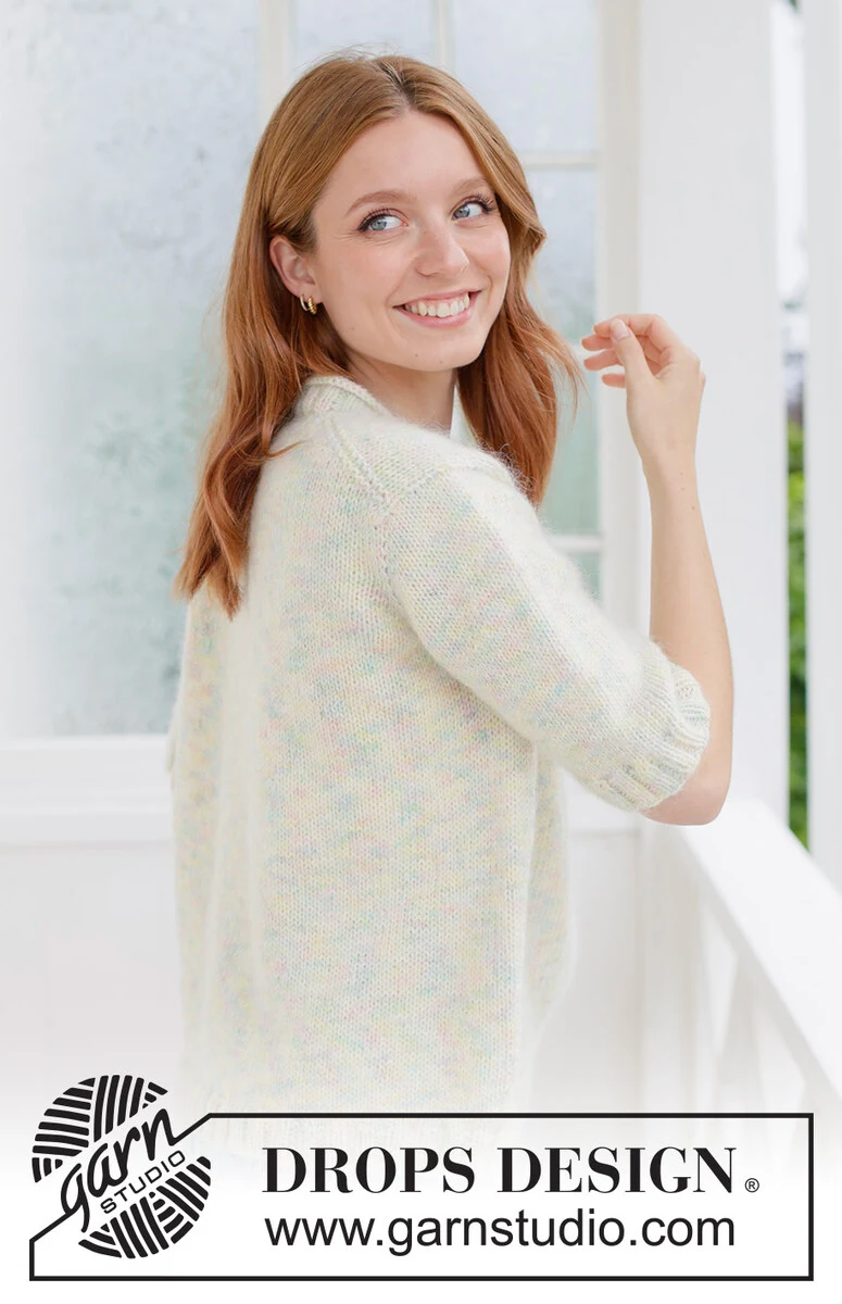 Sweter na drutach z włóczek DROPS Fiesta i DROPS Kid-Silk. Przerabiany od góry do dołu dżersejem, z europejskim karczkiem, krótkim rękawem i zwijającym się wykończeniem dekoltu. Od XS do XXXL.