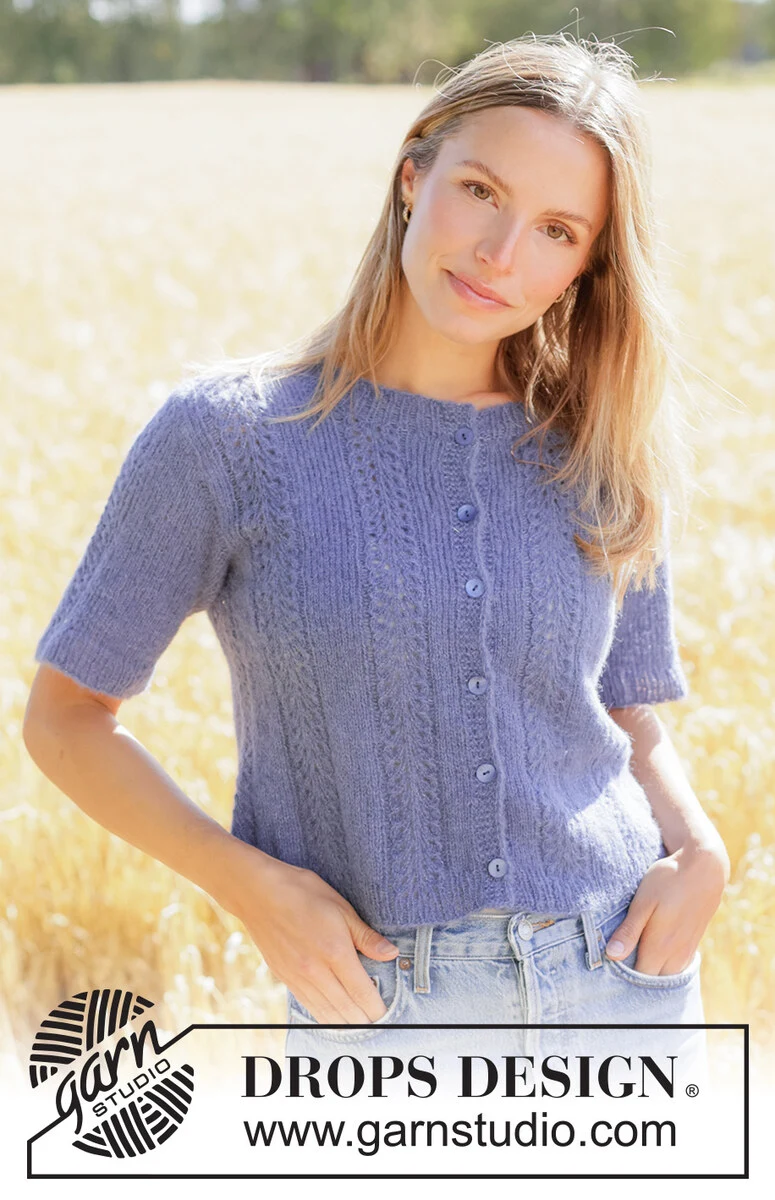 Rozpinany sweter na drutach, z krótkim rękawem, z włóczki DROPS Brushed Alpaca Silk. Przerabiany od góry do dołu, ze ściegiem ażurowym, oczka na rękawy nabierane wokół podkrojów rękawów. Od XS do XXXL.
