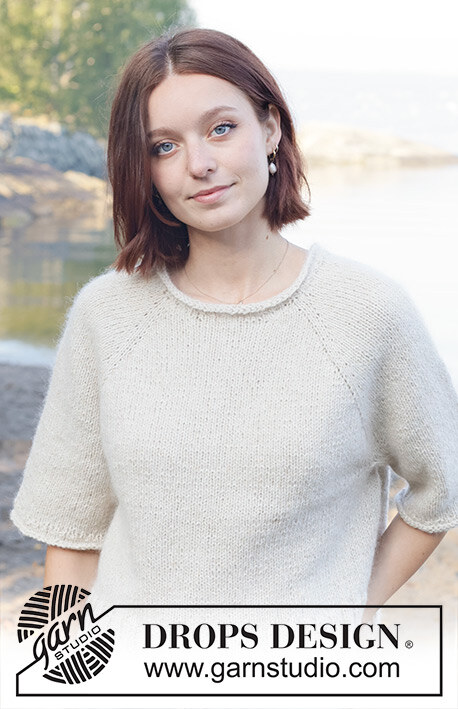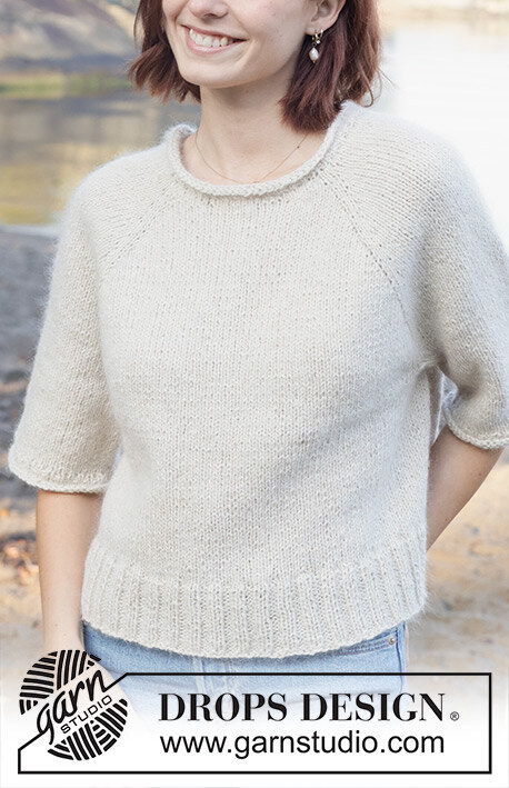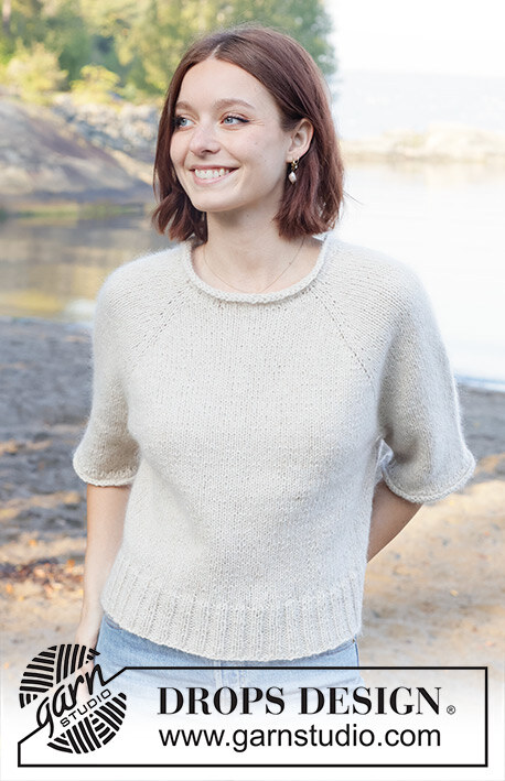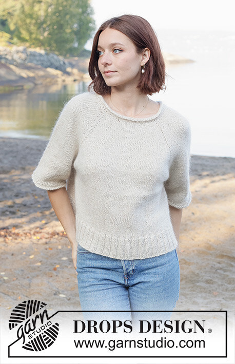Sweter na drutach, przerabiany od góry do dołu, 1 nitką włóczki DROPS Soft Tweed i 1 nitką DROPS Kid-Silk. Przerabiany dżersejem, z reglanowymi rękawami i krótkim rękawem. Od S do XXXL.