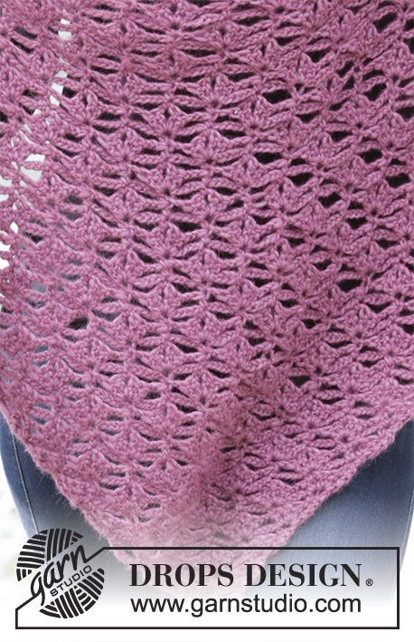 Szal ze wzorem wachlarzy, przerabiany od czubka w górę. Praca jest wykonywana na szydełku z włóczki DROPS Air