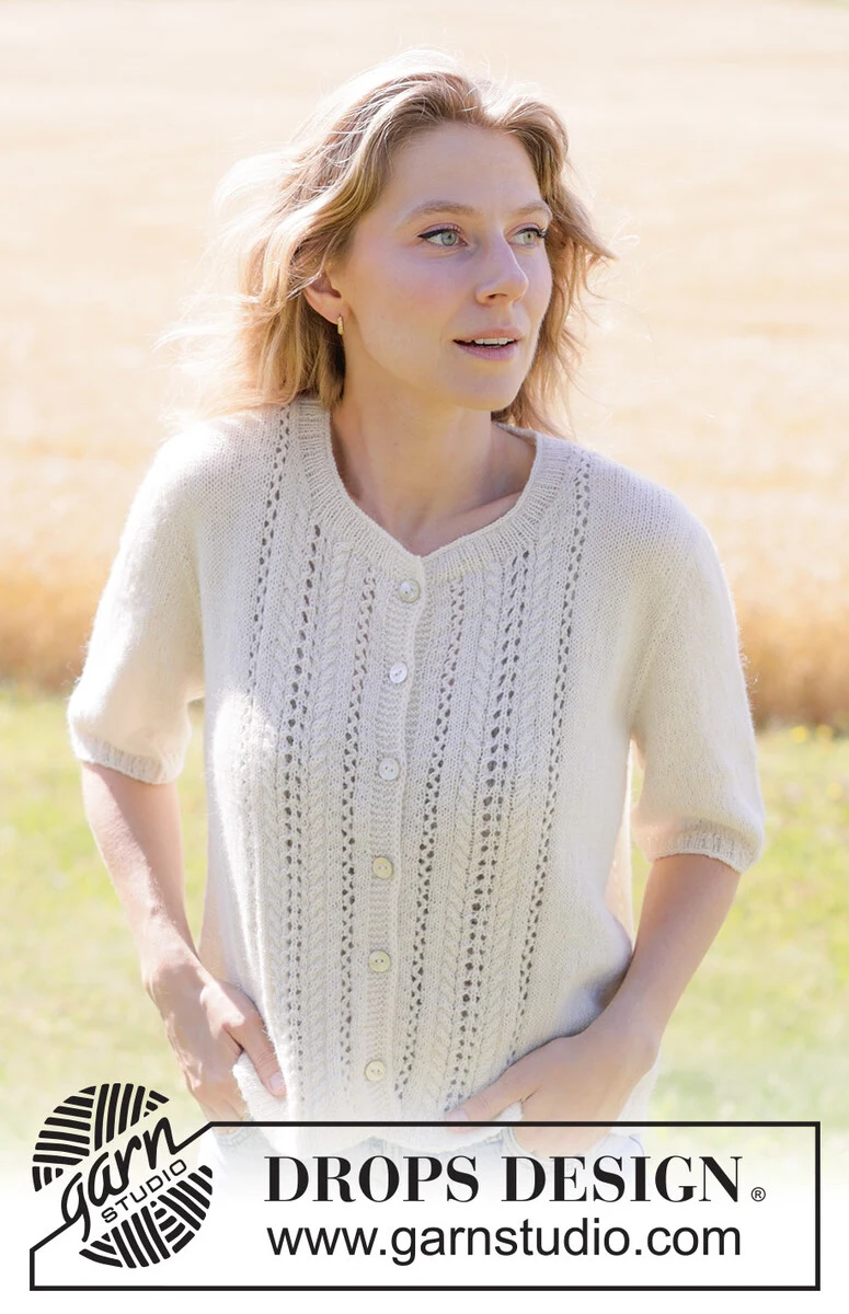 Sweter na drutach, z krótkim rękawem, z włóczki DROPS Nord. Przerabiany od góry do dołu, z europejskim karczkiem ze ściegiem ażurowym i I-cordem. Od XS do XXXL.
