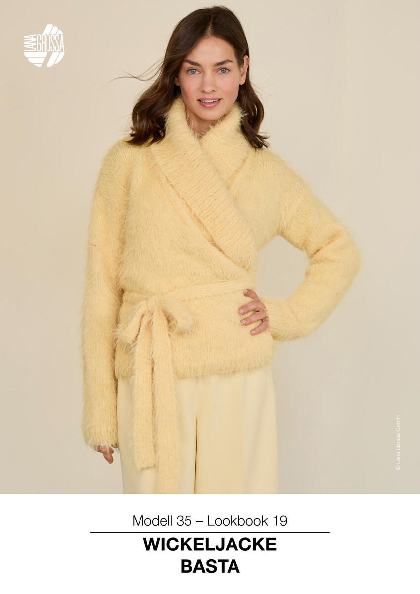 Sweter kopertowy wykonany jest z przędzy Lana Grossa Basta. Dzianina jest gładka z ściągaczem, kołnierzem szalowym i paskiem do wiązania.